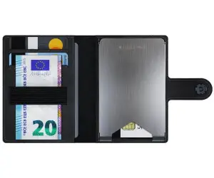 - Integrierter RFID-Blocker unter der Metallabdeckung zum Schutz persönlicher Daten (bis zu sechs Karten)